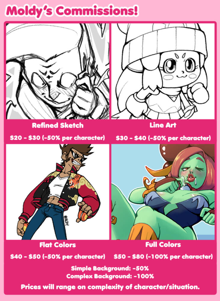 Call me MOLDY! My pronouns are THEY/THEM and HE/HIM. I am a GROWN-UP and a FREELANCE ILLUSTRATOR with an emphasis in CHARACTER DESIGN and CONCEPT ART. I sometimes also do EROTIC ART on my 18+ account. I am a FUNGUS.